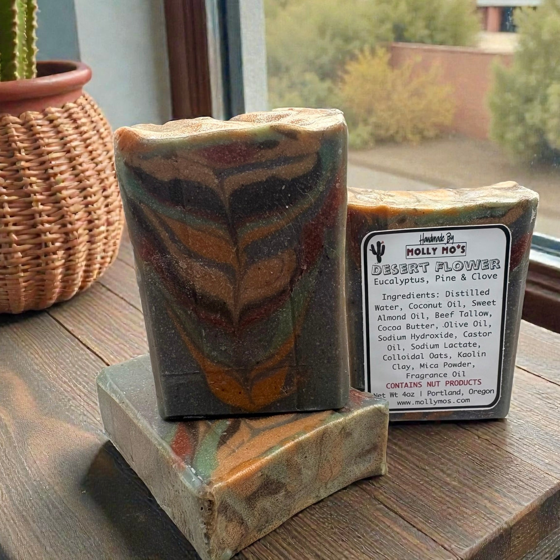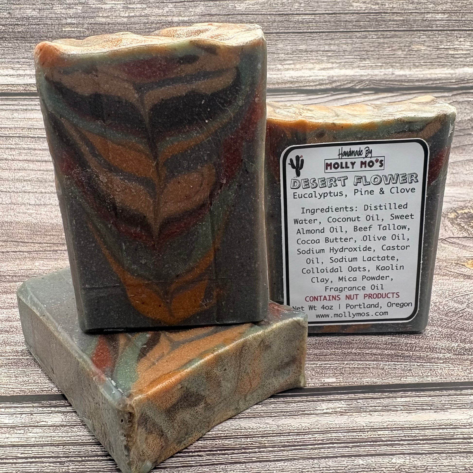Desert Flower is a visually striking cold process soap inspired by the rich, warm hues and vibrant beauty of desert landscapes. Its design features an intricate blend of green, nacarat (a vivid orange-red), wine red, dark brown, and reddish gold, evoking the mesmerizing patterns of a desert sunset.