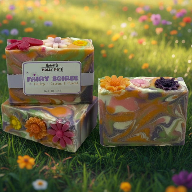 Step into an enchanted garden party with Fairy Soirée, a soap as magical as its name. Swirls of pink, purple, orange, and white dance together in a dreamy design, crowned with three delicate flower embeds on top—like blossoms laid out for an whimsical celebration.