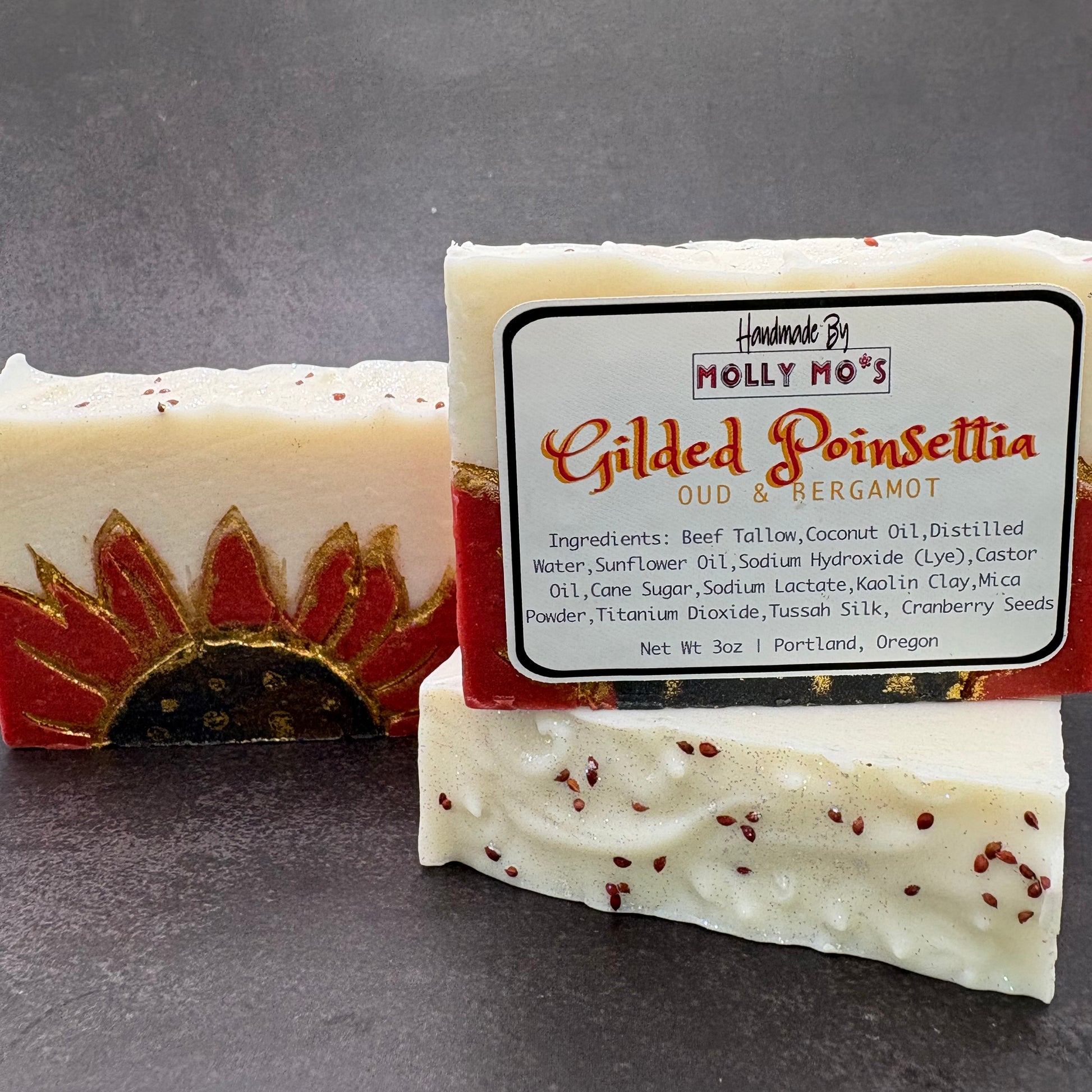 🌺 Elevate your holiday ritual with Gilded Poinsettia, a luxurious soap that blends festive elegance with rich, earthy sophistication. Each bar is a handcrafted work of art—featuring a golden poinsettia bloom, cranberry seeds for gentle exfoliation, and swirls of deep red and shimmering gold that evoke the warmth of a holiday hearth.