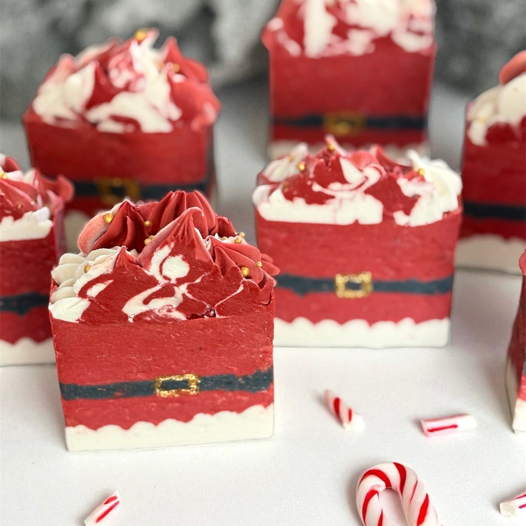Dear Santa is a jolly layered bar that looks just like the Big Guy himself—complete with his red suit, black belt, and gold buckle!
