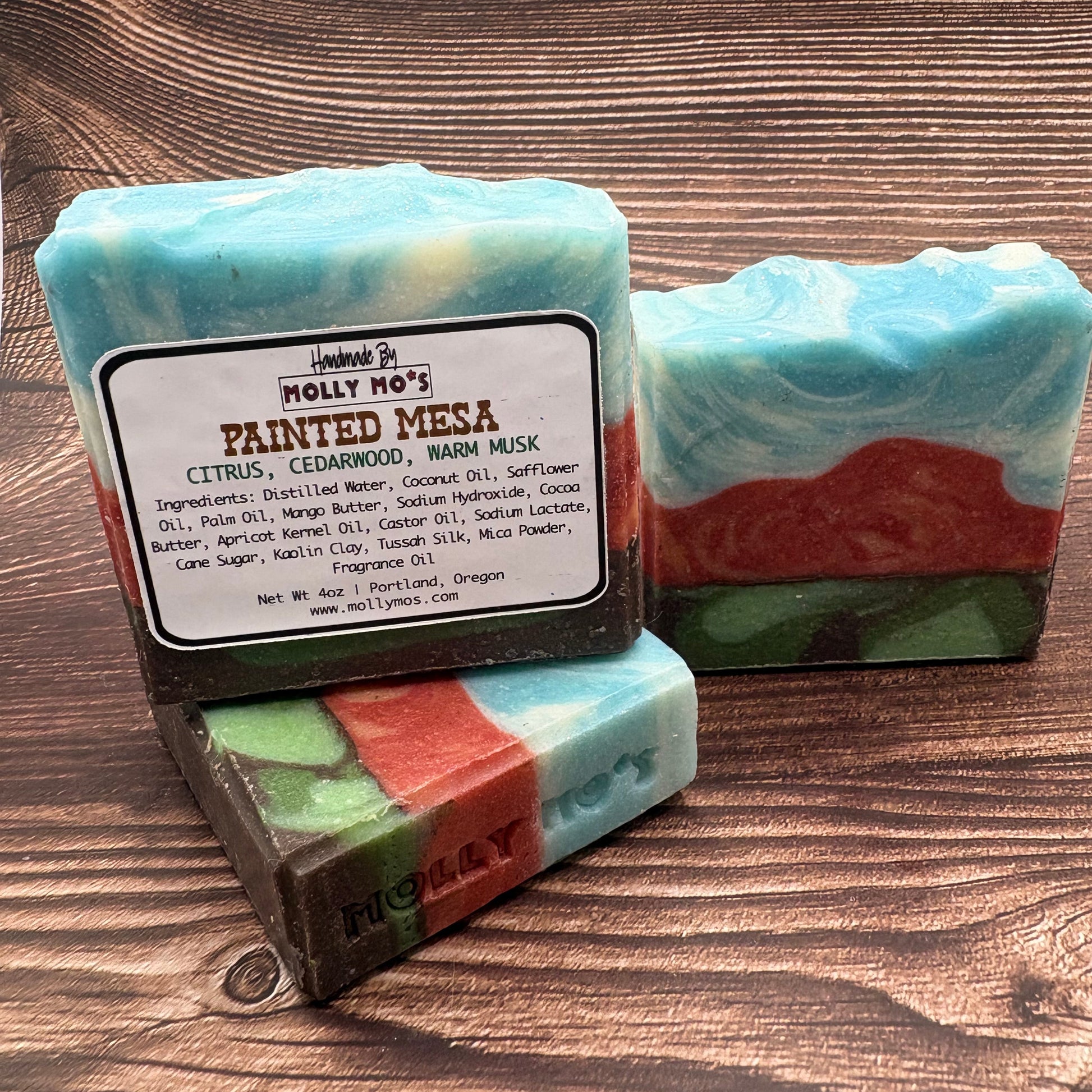 Inspired by the breathtaking layers of a desert landscape at sunset, Painted Mesa is a work of art in every bar. From earthy browns and greens of the canyon floor, to striking streaks of tangerine, purple-reds, and the soft blues of an open sky—this soap is a colorful journey through nature’s palette.